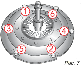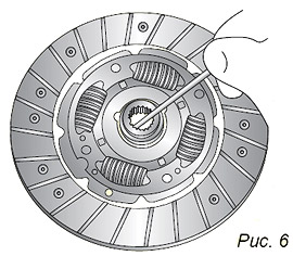 Правильная установка комплектов сцепления HOLAПеред снятием сцепления в автомобилях с гидроприводом иногда необходимо слить жидкость, используя шланг и емкость. Процесс этот довольно прост. Один конец шланга надеваем на штуцер прокачки рабочего цилиндра, а другой опускаем в емкость с тормозной жидкостью. Затем вывертываем штуцер на половину оборота и нажимаем на педаль сцепления до тех пор, пока жидкость не будет удалена из привода. После этого отсоединяем трубку и шланг, соединяющие главный и рабочий цилиндры, оттяжную пружину, расшплинтовываем толкатель и снимаем рабочий цилиндр. Если автомобиль оборудован тросовым приводом, перед снятием сцепления необходимо отсоединить трос и его крепление. После снятия коробки передач вместе с картером снимаем сцепление. С помощью фиксатора блокируем маховик и поочередно отворачиваем на один-два оборота болты крепления кожуха сцепления к маховику до момента снятия усилия нажимной пружины (рис.5). ![]() Кожух сцепления снимают в сборе с нажимным диском. Если планируется установка нажимного диска, то рекомендуется пометить его положение на маховике. Помните, что после снятия нажимного диска без крепления останется ведомый. Упав, он может деформироваться даже от небольшого удара и придти в негодность. Чтобы не повредить при снятии сцепления соединительные пластины, не следует поднимать его за упорный фланец нажимной пружины. После снятия сцепления рекомендуется очистить нажимной и ведомый диски. Производя демонтаж сцепления, проверьте состояние выжимного подшипника на наличие осевого зазора и на легкость вращения. Перед тем как установить сцепление, необходимо проверить состояние шлицев на ступице ведомого диска и на ведущем валу коробки передач и смазать шлицы специальной консистентной смазкой. Слой смазки должен быть тонким и равномерным, в противном случае при работе сцепления излишки смазки будут отбрасываться на его рабочие поверхности, что может повлечь его поломку (рис.6). ![]() Устанавливают сцепление в обратном порядке, проверив состояние подшипника в торце коленчатого вала. При установке ведомого диска его располагают выступающей частью в сторону коробки передач и обязательно центрируют специальной оправкой. В этом качестве можно использовать ведущий вал или его часть от старой коробки передач. При установке старого кожуха сцепления не забудьте совместить метки на маховике и кожухе, чтобы не нарушать заводскую балансировку. В процессе установки сцепления необходимо затягивать крепежные болты постепенно и, что особо важно, по диагонали. Это предотвратит коробление кожуха «корзины». Перед затяжкой болтов «корзины» оправку, используемую для центровки ведомого диска, надо немного пошевелить вверх-вниз и вправо-влево для более точной центровки ведомого диска (рис.7). ![]() Также, меняя сцепление, следите, чтобы коробка не «повисала» на первичном валу. Это может привести к деформации ведомого диска и вызвать заедание сцепления или его поломку. Ни в коем случае не комбинируйте элементы сцепления от разных производителей. Это может обернуться гораздо более серьезной поломкой и, как следствие, большими затратами на их устранение. В целях обеспечения соосности двигателя и коробки передач следует проверить наличие специальных центрирующих втулок. Установка коробки без э
